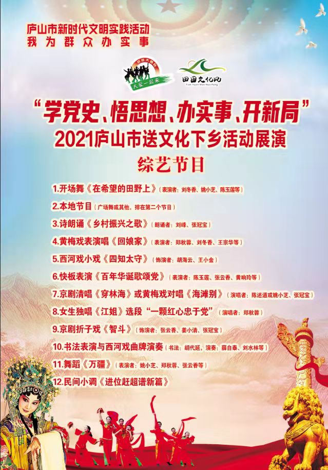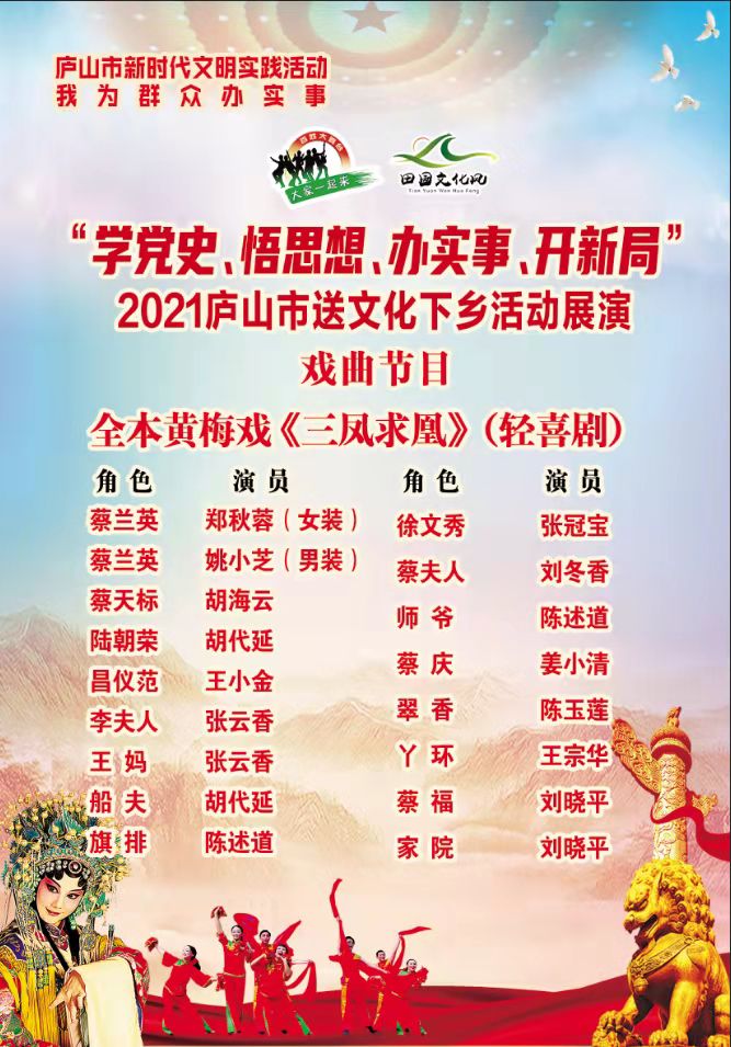 庐山市公共文化服务进村入户,“送戏下乡”项目由中共庐山市委宣传部、市文广新局主办,市文化馆承办。接下来按每个乡镇不低于4场的标准进行巡演。在巡演的同时,坚决贯彻落实好《江西省公共文化服务保障条例》,进一步加强现代公共文化服务体系建设,丰富人民群众精神文化生活和传承中华优秀传统文化、红色文化,弘扬社会主义核心价值观,坚定文化自信,充分提升人民群众文明素质。