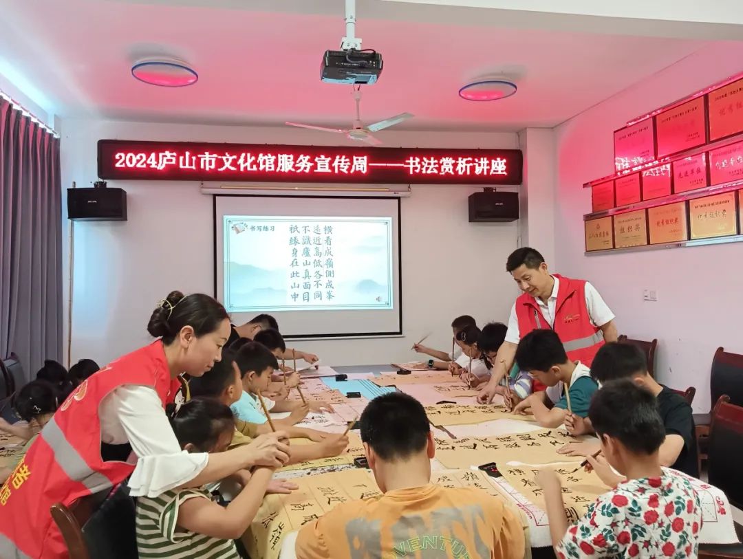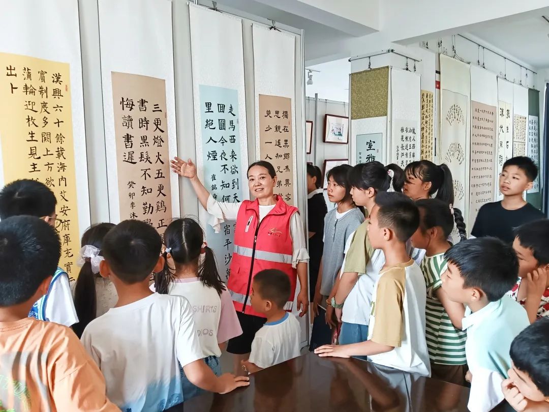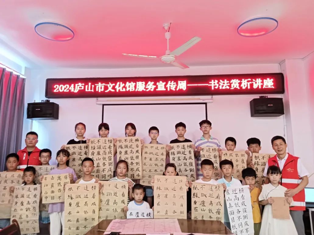 与此同时,学生们还去参观了庐山市文化馆二楼的书画展,学习前辈们的优秀作品,充分激发起了大家学习书法的热情。5月20日-26日是全国文化馆服务宣传周,为深入学习贯彻习近平文化思想,更好发挥文化馆对推动公共文化服务高质量发展的重要作用,庐山市文化馆以文化馆服务宣传周为契机,以“文化馆:人民的终身美育学校”为主题,开展系列文化活动,此次书法赏析讲座为系列活动的第六场活动。