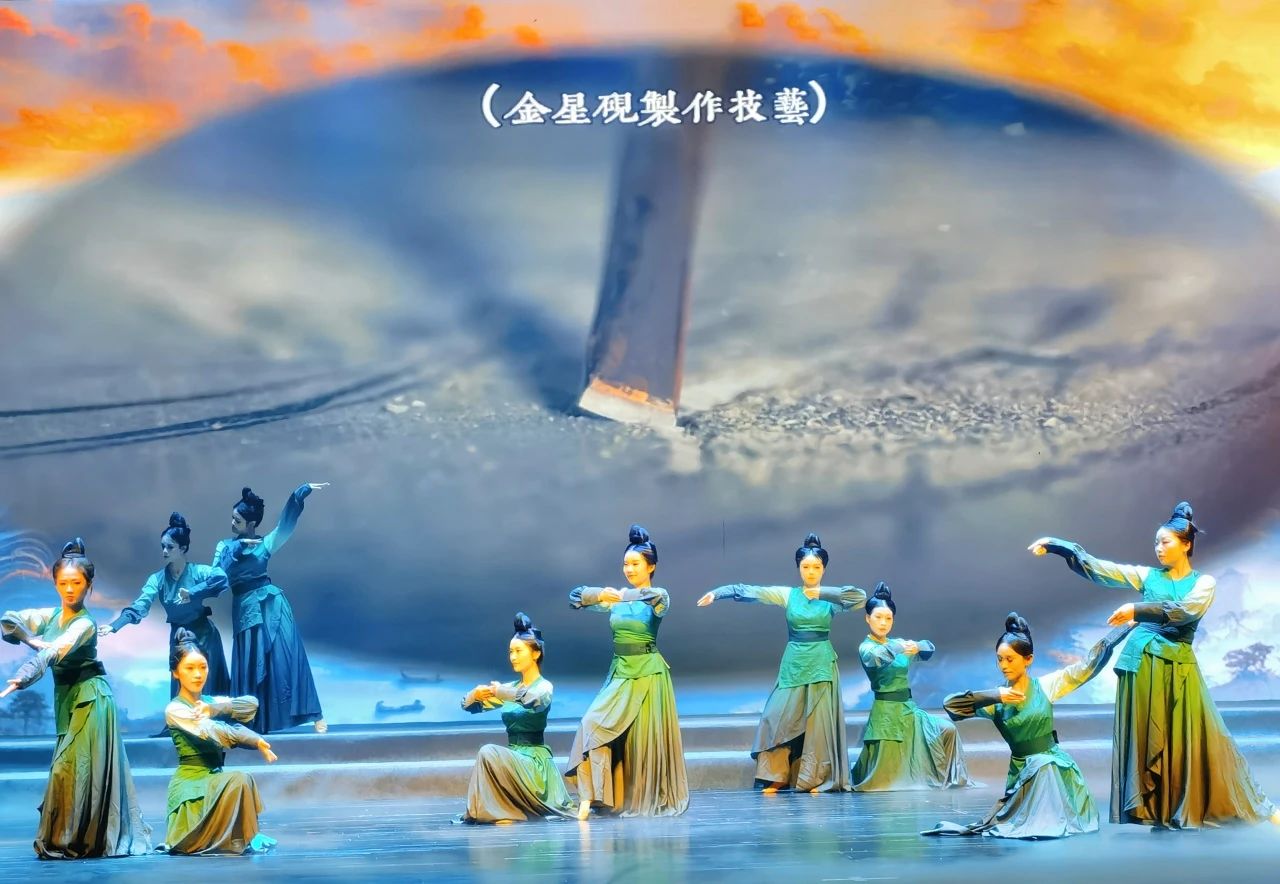 随后,《庐山石韵》篇章以金星砚制作技艺为核心,通过情景演绎与舞台装置艺术,重现匠人雕琢砚台的精湛技艺,将金星砚“坚韧细腻、温润莹洁”的特质融入每一刀刻画中;配合动态影像,展示砚石从开采到成品的全过程,让观众沉浸式感受“石上生金”的神奇魅力。