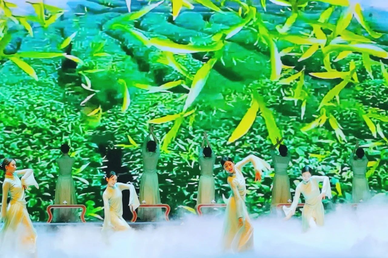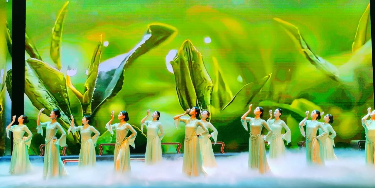 《茶韵禅心》篇章以东林雨露老枞红茶制作技艺为脉络,茶艺师现场演绎非遗制茶工序,茶香与舞台烟雾交织,营造出云雾缭绕的意境;现代舞与古典民乐碰撞,舞者化身“茶叶”在茶汤中舒展,配合全息投影呈现的茶园风光,演绎茶与山水的千年对话。