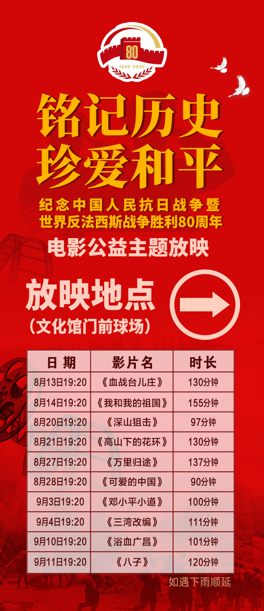 活动将于8月13日—9月11日晚19:20(如遇下雨顺延)在牯岭镇文化馆前广场举行,届时将放映多部经典抗战题材影片,如真实还原战争残酷的《血战台儿庄》,展现爱国情怀的《我和我的祖国》,以及生动刻画英雄群像的《八子》等。这些影片从不同角度再现了中国人民在抗日战争中浴血奋战、保家卫国的英雄事迹,也展现了世界反法西斯力量携手抗击侵略的正义之举。