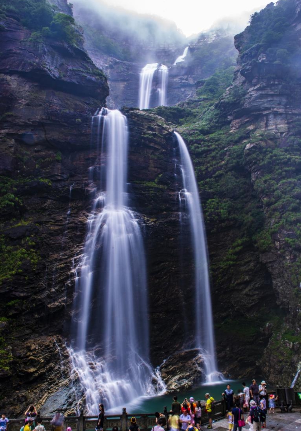 三叠泉为全国四大名瀑之一,是庐山第一奇观,它位于庐山东南,汇庐山冰川之水自五老峰北岸流出,落差155米,分三级跌下。“上级如飘云拖练;中级如碎玉摧冰;下级如玉龙走潭、散珠喷雪又似仙女飘带”。它以“飘如雪、断如雾、缀如流、挂如帘”的绝世景致,闻名中外。素有“不到三叠泉,不算庐山客”之说。