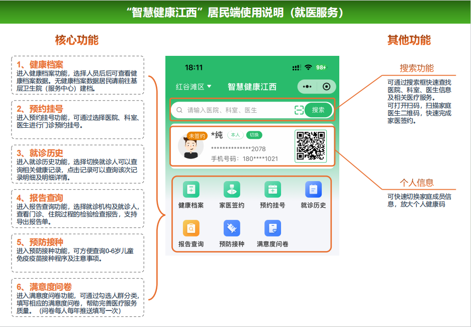 亲爱的庐山市居民朋友们,我省“智慧健康江西”小程序在2026年进行了改版升级,旨在提高居民电子健康档案开放服务质量,推动居民健康档案数字化、动态化管理,更为大家提供更加优质便捷的医疗健康服务。居民朋友们可在“智慧健康江西”小程序上一键轻松查询自己及家人的健康档案信息、家签情况、各种就诊及检查报告信息、预防接种情况、自我健康管理情况、随访与体检情况等,还可以通过不定期更新的科普文章学习各种健康知识,通过参与满意度问卷调查来促进我们的工作和服务水平的提升,让我们为大家提供更便捷、更高效、更安全的服务。