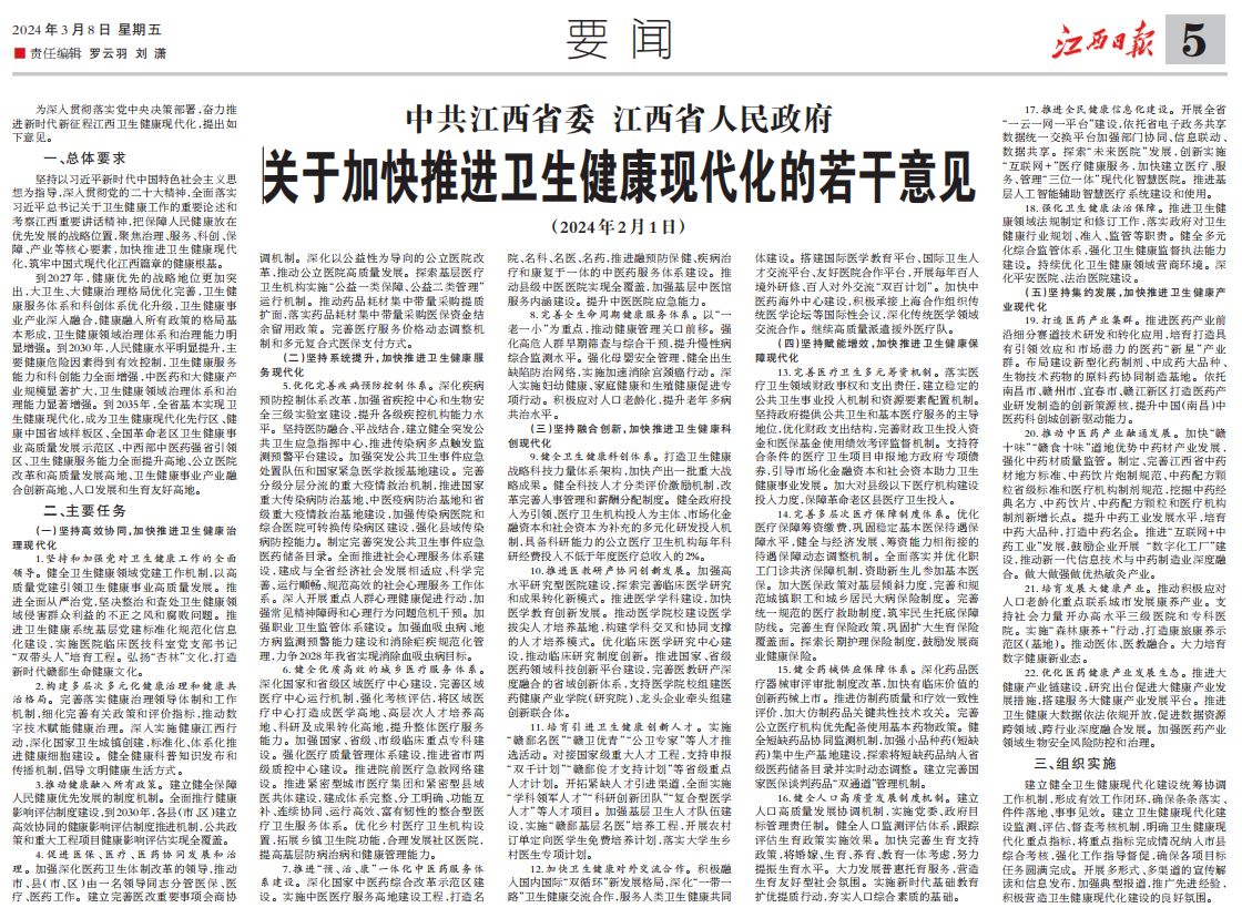 [江西日报]中共江西省委 江西省人民政府关于加快推进卫生健康现代化的若干意见(2024年2月1日)