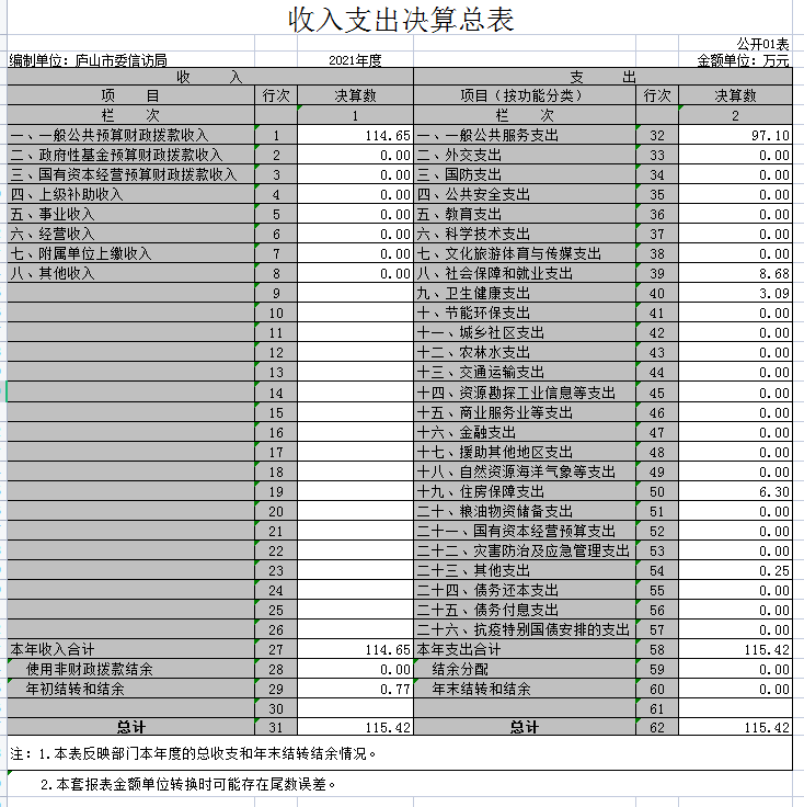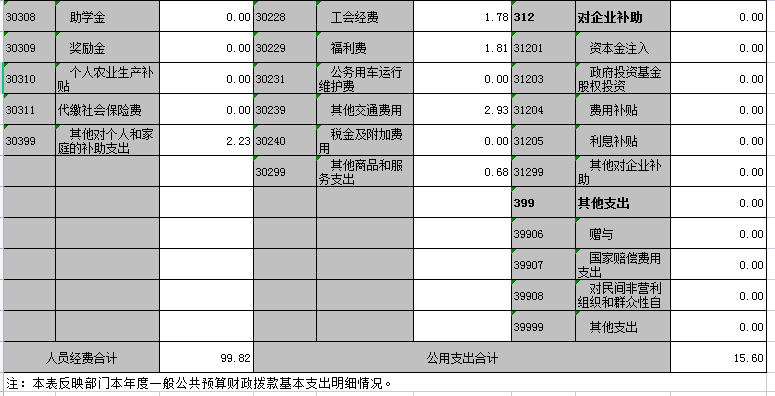 本部门2021年度支出总计115.42万元,其中本年支出合计115.42万元,较2020年增加14.48万元,增长14.34%,主要原因是人员及办公经费增加,年末结转和结余0.77万元,较2020年减少15.99万元,主要原因是:所有结转资金收归国库。