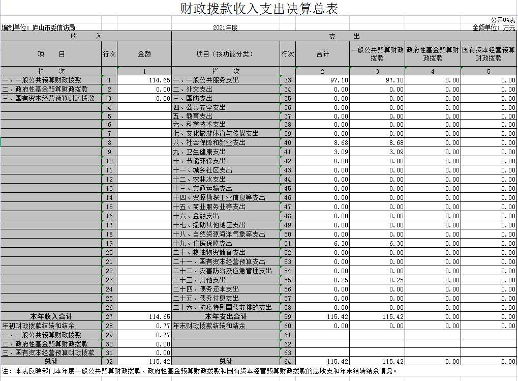 本部门2021年度收入总计114.65万元,其中年初结转和结余0.77万元,较2020年增加8.93万元,增长了8.44%;本年收入合计115.42万元,较2020年减少7.06万元,减少了5.76%,主要原因是控制开支。