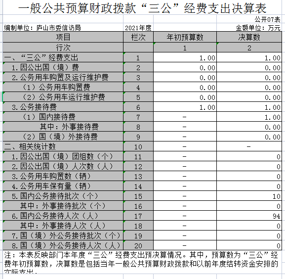 七、“三公”经费:纳入县级财政预决算管理“三公”经费 ,指部门使用财政拨款安排的因公出国(境)费、公务用车购 置及运行费和公务接待费。其中,因公出国(境)费反映单位 公务出国(境)的国际旅费、国外城市间交通费、住宿费、伙食费、培训费、公杂费等支出;公务用车购置及运行费反映反 映单位公务用车车辆购置支出(含车辆购置税)及租用费、燃 料费、维修费、过路过桥费、保险费、安全奖励费用等支出; 公务接待费反映单位按规定开支的各类公务接待(含外宾接待 )支出。