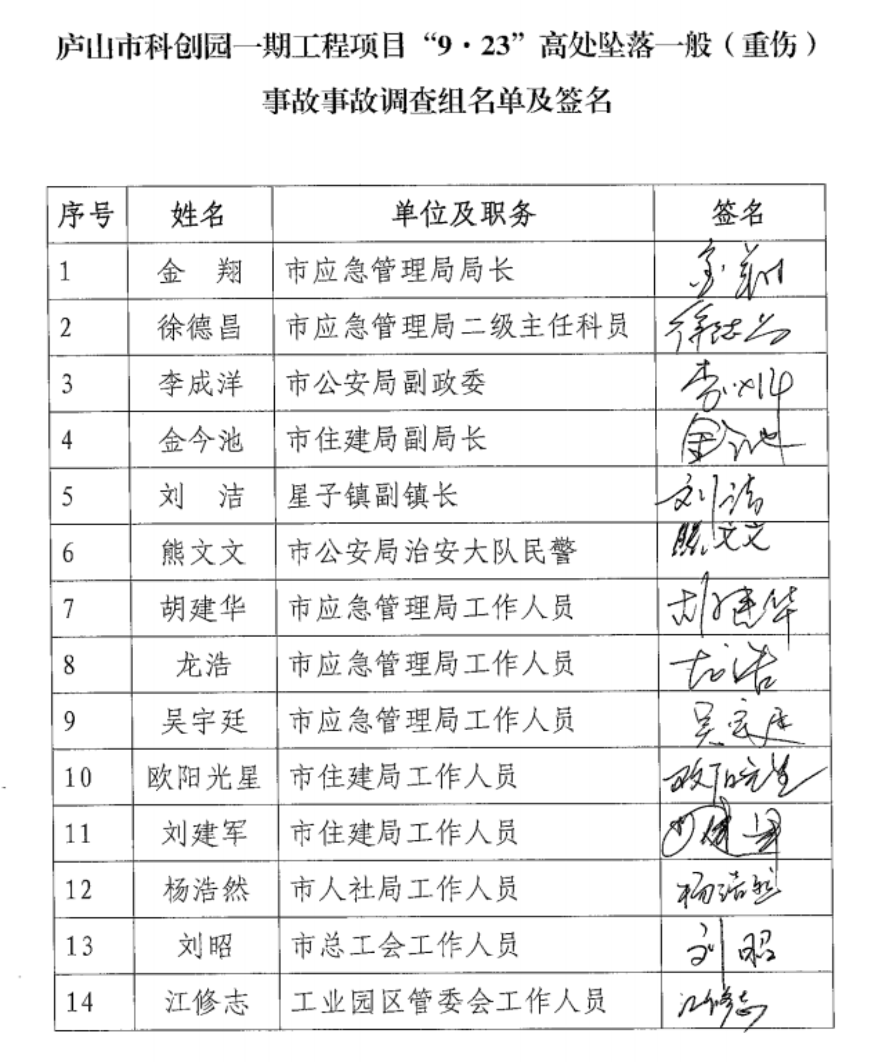 庐山市科创园一期工程项目“9·23”高处坠落一般(重伤)事故事故调查组名单及签名