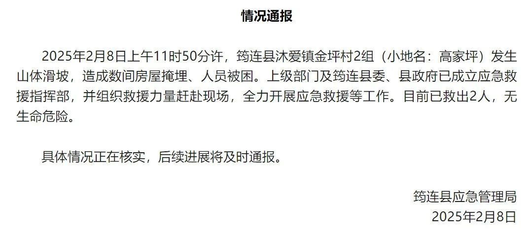 据四川省宜宾市筠连县应急管理局通报,2月8日11时50分许,筠连县沐爱镇金坪村2组发生山体滑坡,造成数间房屋掩埋、人员被困。上级部门及筠连县委、县政府已成立应急救援指挥部,并组织救援力量赶赴现场,全力开展应急救援等工作。