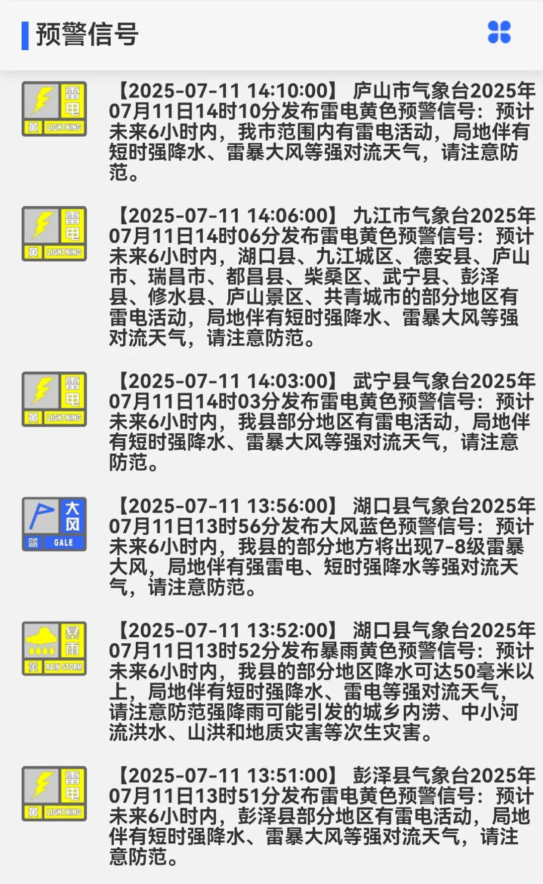 预计未来6小时内,湖口县、九江城区、德安县、庐山市、瑞昌市、都昌县、柴桑区、武宁县、彭泽县、修水县、庐山景区、共青城市的部分地区有雷电活动,局地伴有短时强降水、雷暴大风等强对流天气,请注意防范。