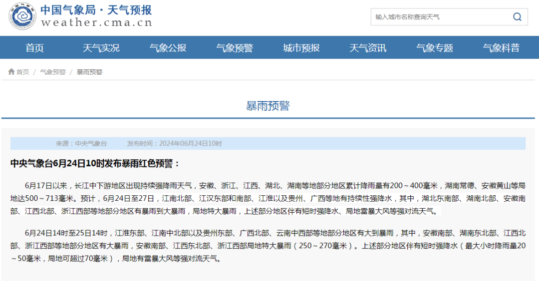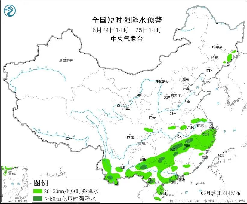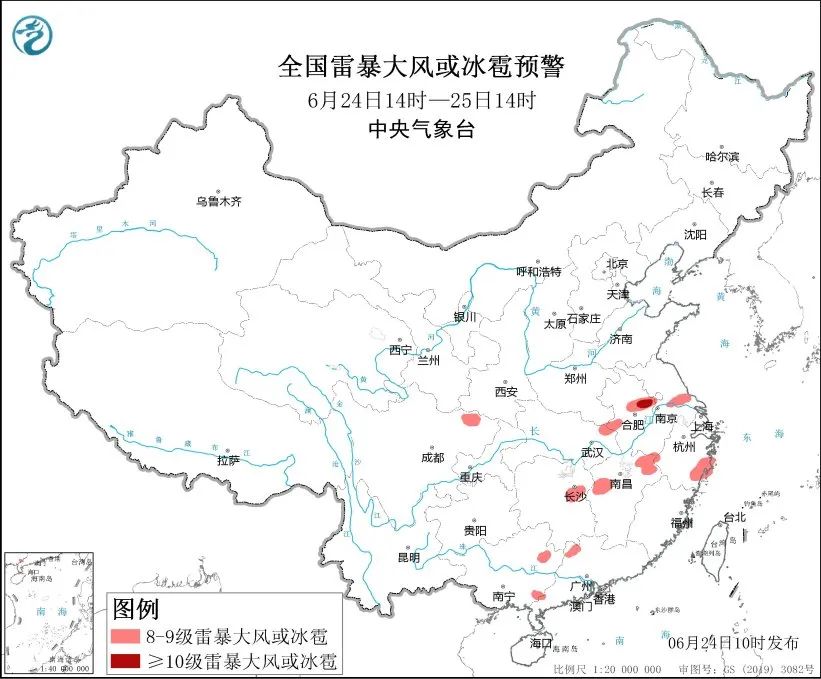 中央气象台6月24日10时继续发布强对流天气蓝色预警:预计6月24日14时至25日14时,安徽中部、江苏中南部、湖北东部、湖南中部、江西中北部、浙江中南部、四川东北部、广西东部、广东西部等地的部分地区将有8级以上雷暴大风或冰雹天气,其中,安徽中部局地将有10级以上雷暴大风;吉林东部、安徽中部、江苏中部、湖北北部、湖南中南部、江西中北部、浙江、福建北部、四川东北部、贵州南部、云南中南部、广西、广东中西部和北部等地的部分地区将有小时雨量大于20毫米的短时强降水天气,其中,湖南中南部、江西中北部、云南西南部、广西北部和南部、广东西南部沿海等地的局地小时雨量大于50毫米,最大可达70毫米以上。