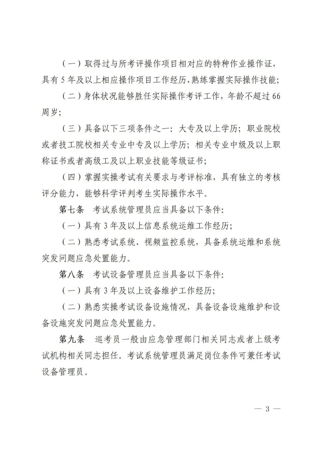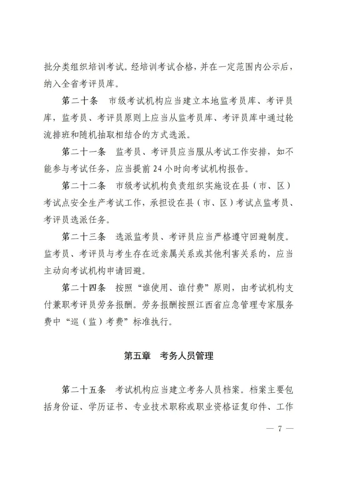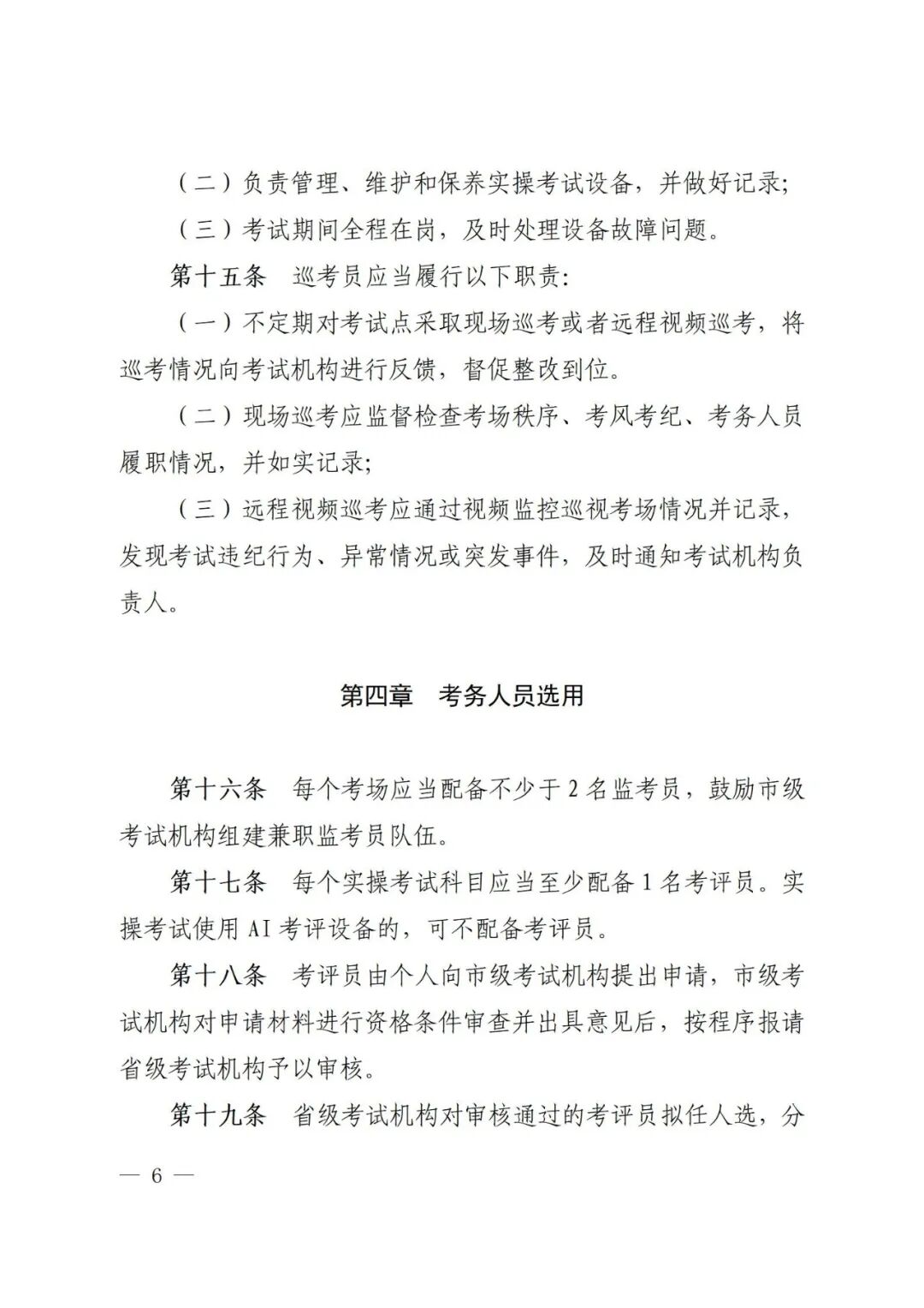 (三)明确考务人员选用管理。明确考评员产生、配备、选派、付费等要求,并确定兼职考评员劳务报酬标准,各地应急管理部门或考试点可结合实际确定专职考评员薪酬标准。同时,对考务人员档案管理、人员备案、业务培训、配证着装等提出要求,通过加强考务人员管理进一步规范考务流程。