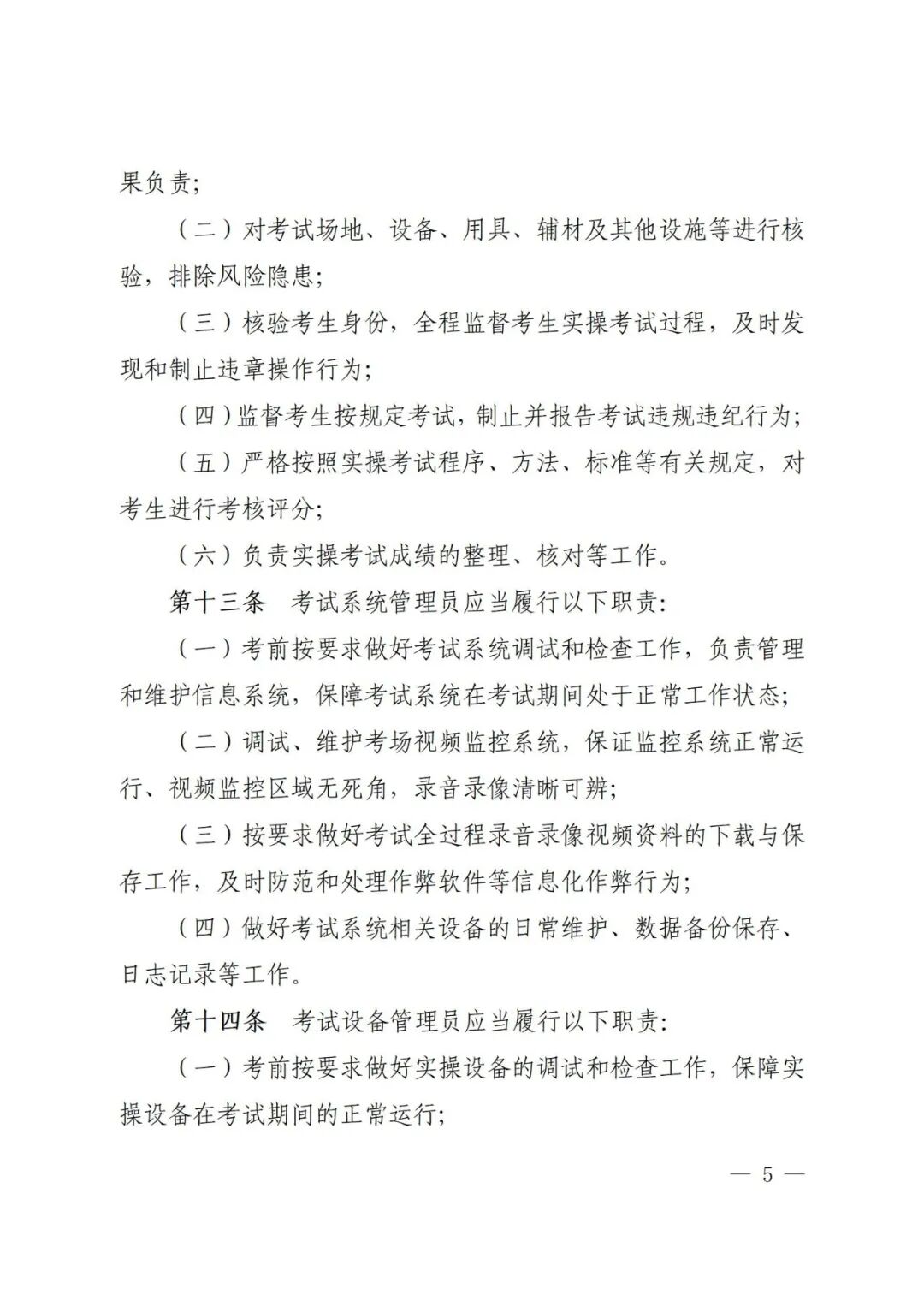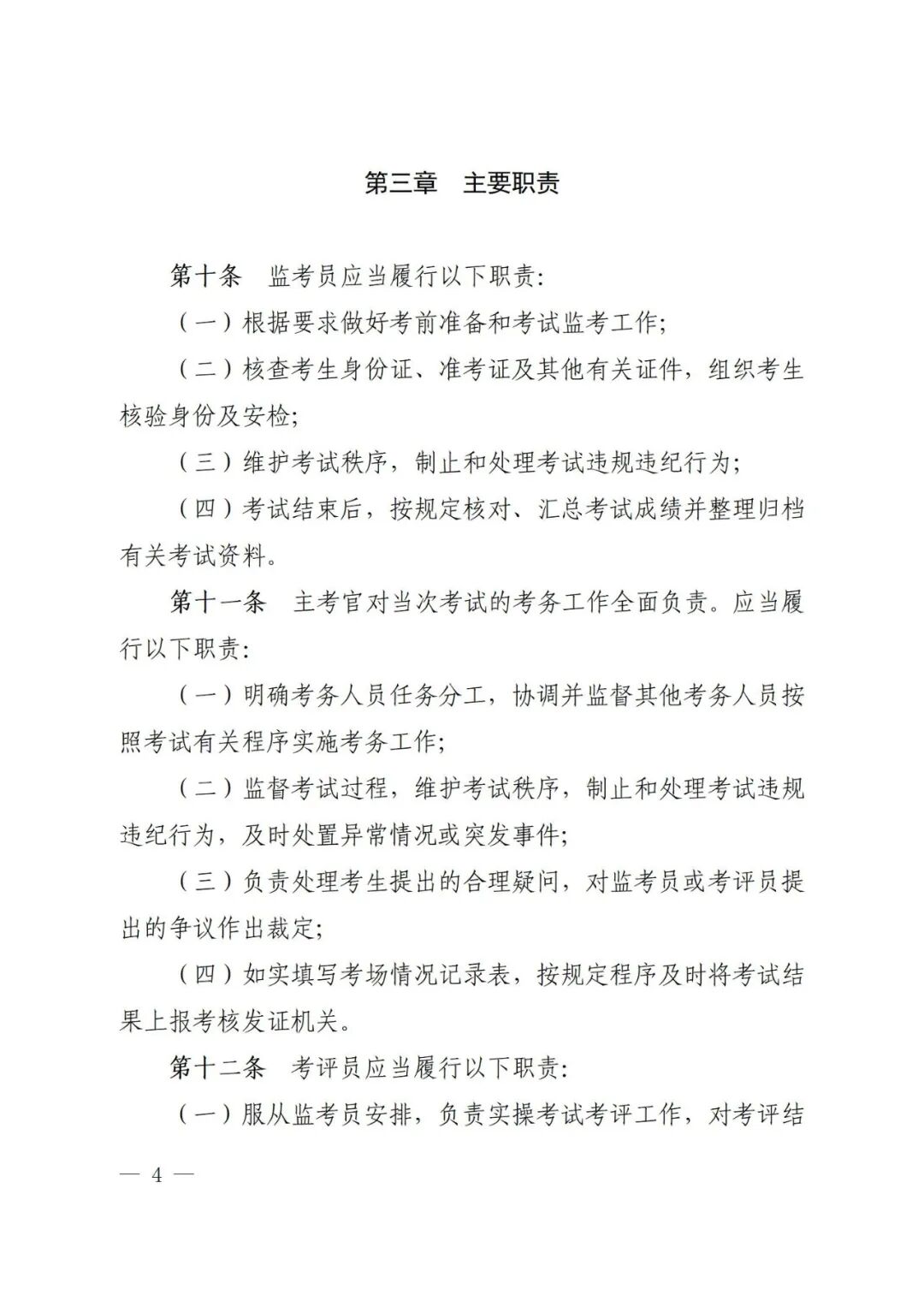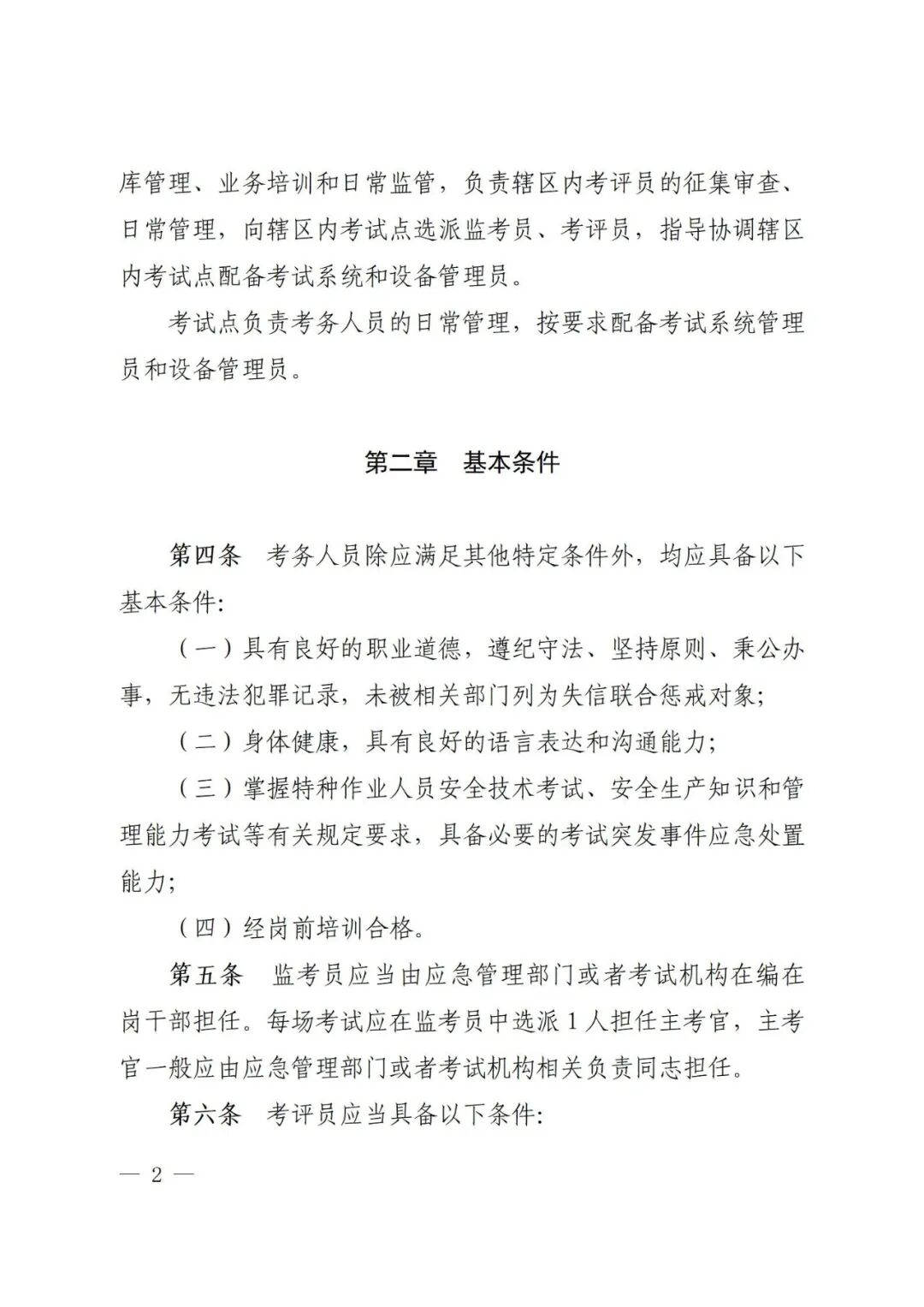 (二)明确考务人员条件职责。除明确四项考务人员均应具备的基本条件外,还根据不同考务人员所承担的职责任务明确了相关特定条件。比如监考员应当由应急管理部门或者考试机构在编在岗干部担任,并结合实际,明确考试系统管理员满足岗位条件可兼任考试设备管理员,并可由聘用人员担任。同时,逐项明确考务人员职责,实现定人定岗定责。
