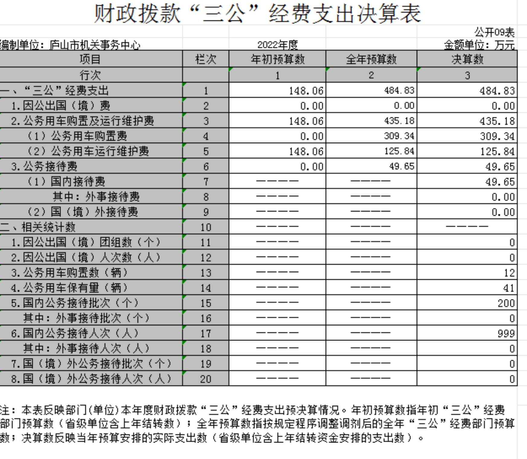 八、“三公”经费:指用财政拨款安排的因公出国(境)费、公务用车购置及运行维护费和公务接待费。其中,因公出国(境)费反映单位公务出国(境)的国际旅费、国外城市间交通费、住宿费、伙食费、培训费、公杂费等支出;公务用车购置及运行维护费反映单位公务用车车辆购置支出(含车辆购置税、牌照费),按规定保留的公务用车燃料费、维修费、过桥过路费、保险费、安全奖励费用等支出;公务接待费反映单位按规定开支的各类公务接待(含外宾接待)支出。