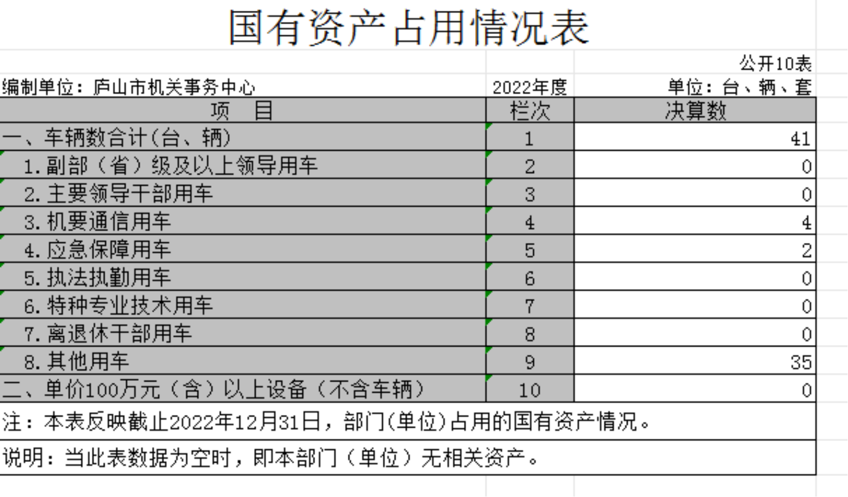 截至2022年12月31日,本单位国有资产占用情况见公开10表《国有资产占用情况表》。其中车辆中的机要通信4辆,应急保障2辆,其他用车35辆,主要是全市的公务接待用车。