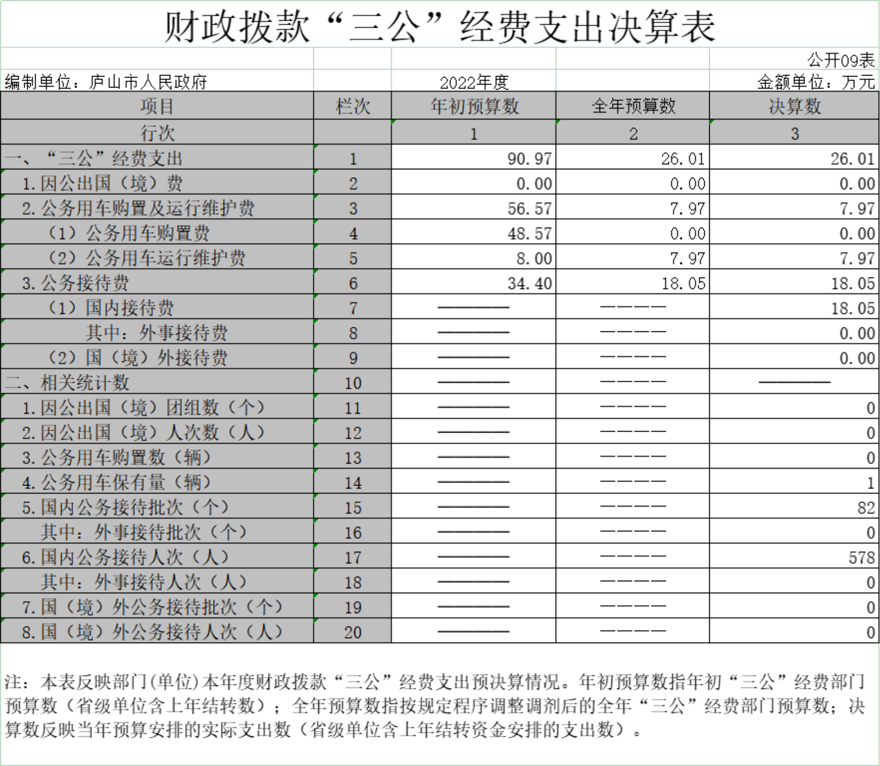 七、“三公”经费:指用财政拨款安排的因公出国(境)费、公务用车购置及运行维护费和公务接待费。其中,因公出国(境)费反映单位公务出国(境)的国际旅费、国外城市间交通费、住宿费、伙食费、培训费、公杂费等支出;公务用车购置及运行维护费反映单位公务用车车辆购置支出(含车辆购置税、牌照费),按规定保留的公务用车燃料费、维修费、过桥过路费、保险费、安全奖励费用等支出;公务接待费反映单位按规定开支的各类公务接待(含外宾接待)支出。