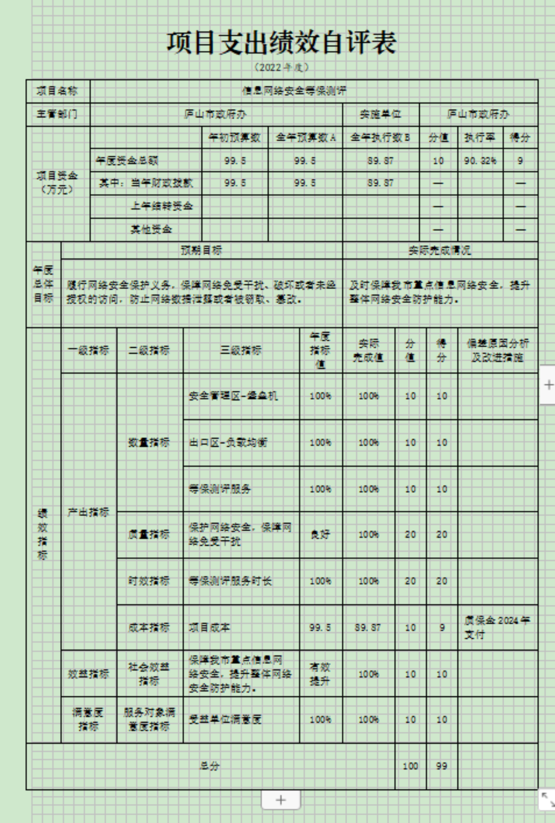 组织对“政府信息工程建设”、“基层党建信息化建设项目”等20个项目开展了部门评价,涉及一般公共预算支出2654.07万元,政府性基金预算支出0万元,国有资本预算支0万元。从评价情况来看,市政府办今年的13个专项,从产出指标、效益指标、满意度指标,12项二级指标总分达到95分。