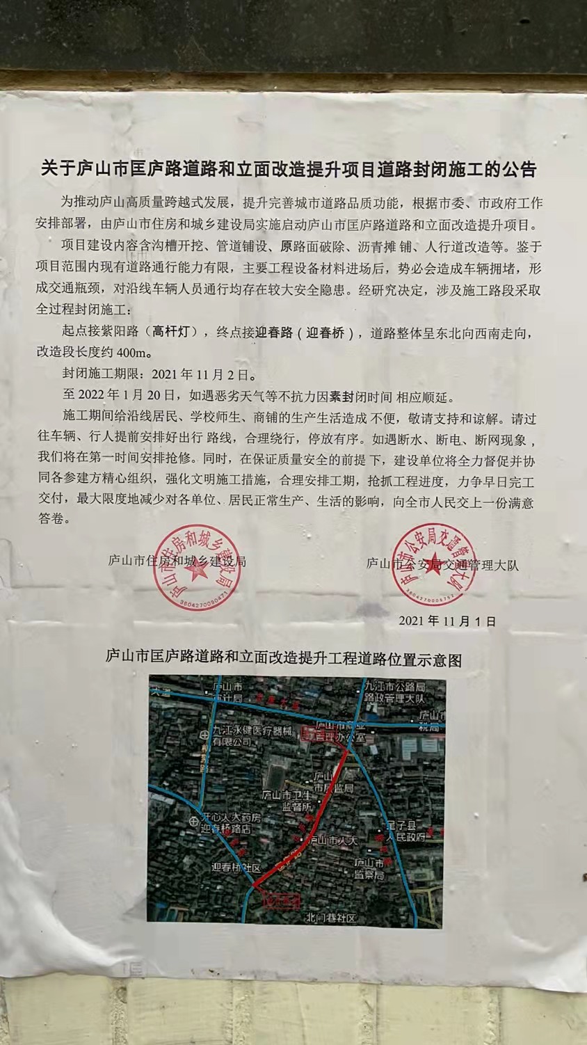 匡庐路道路和立面改造提升项目道路封闭施工的公告