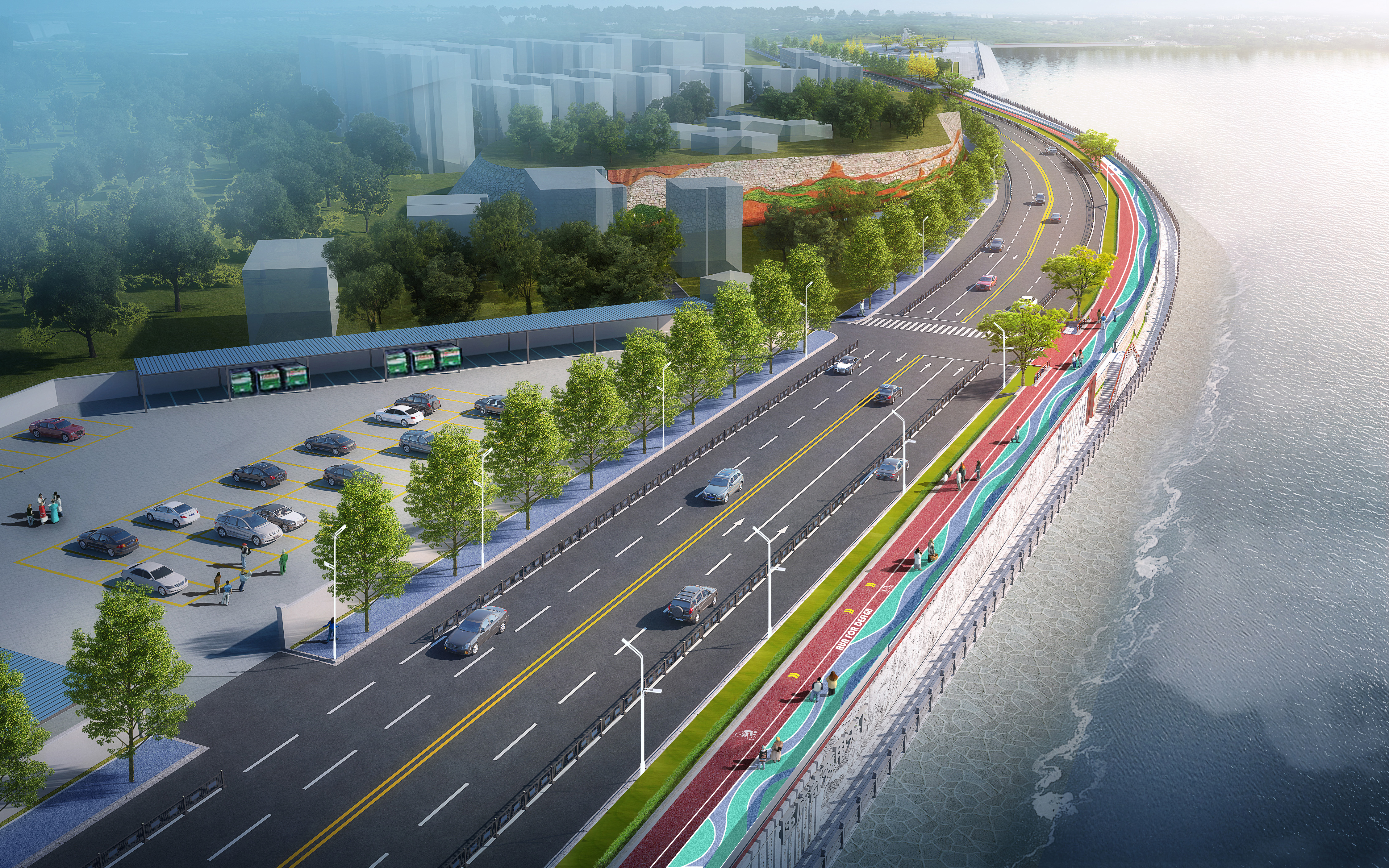 项目内容及规模:庐山市湖滨路沿线景观规划提升工程西起港西路交叉口,东至庐山市第二中学,全长约3.6公里,道路宽度18米,平均宽度约20米。设计内容包括道路拓宽、雨污管网、道路两侧的场地铺装、机非停车位设置、景观绿化、防浪墙美化、停车场设置和景观节点提升等。