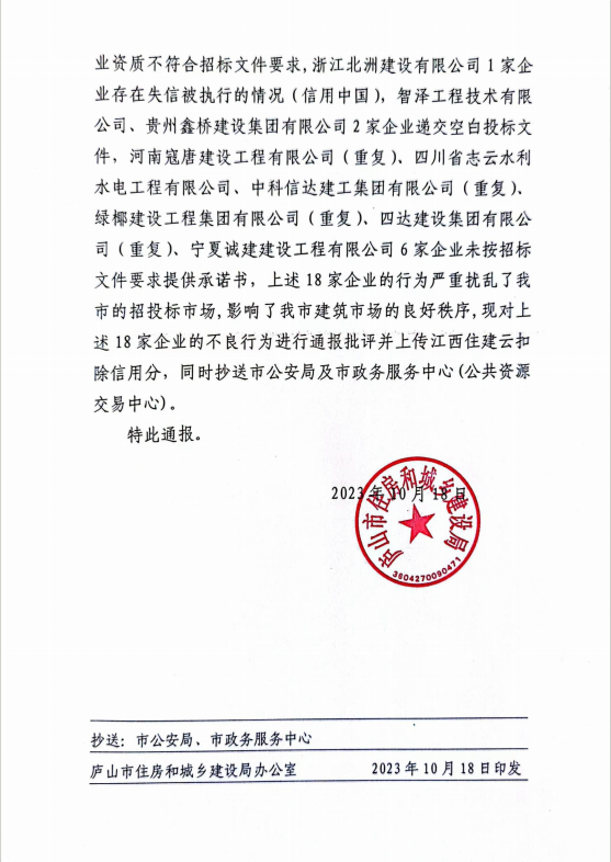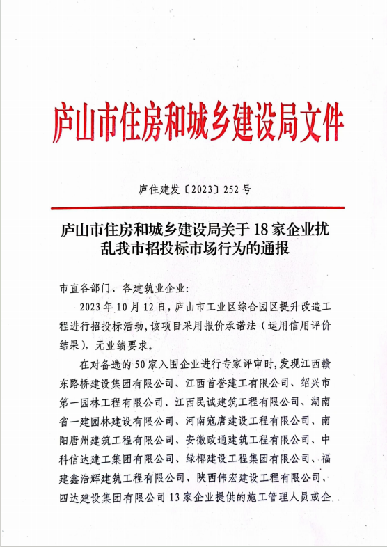 庐山市住房和城乡建设局关于18家企业扰乱我市招投标市场行为的通报