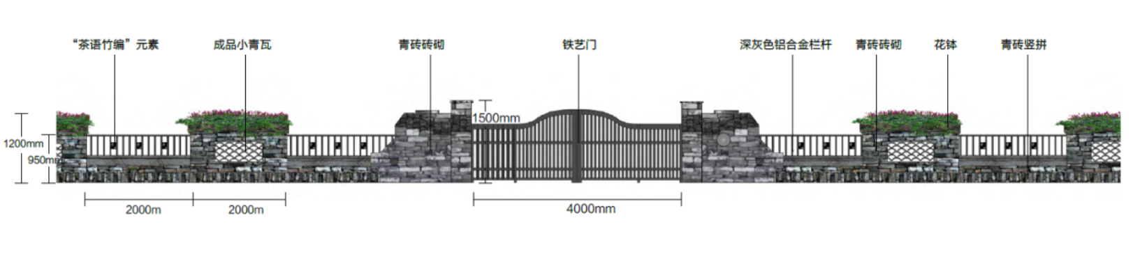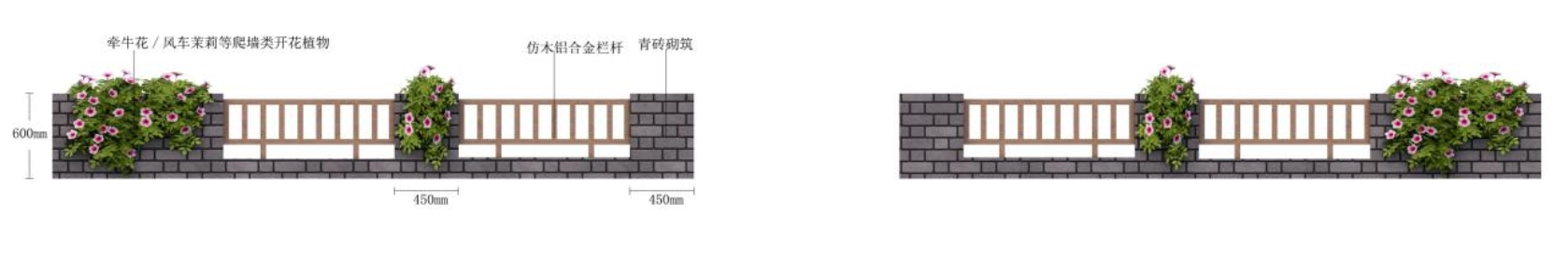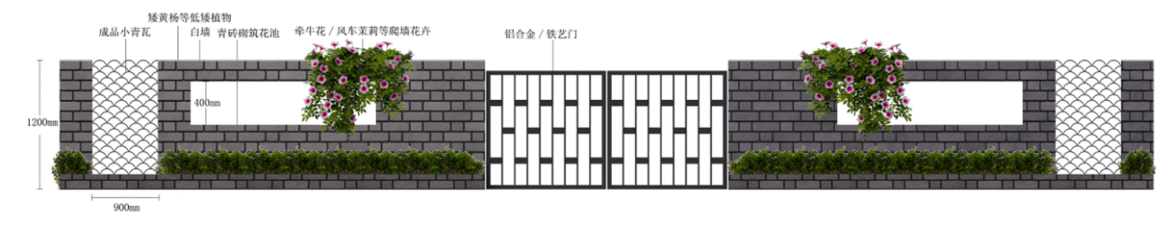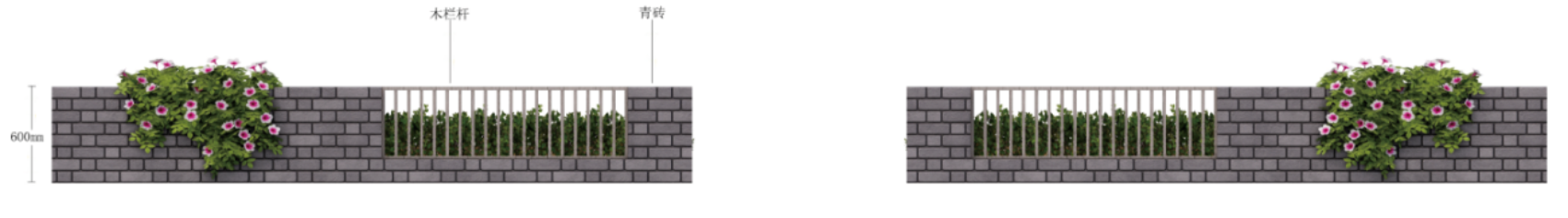 5.整个庭院面积(含房屋面积)按照无违建标准要求,地下面积与主房审批面积相一致,位置与主房重合,深度不超过2.8 米。不违反庭院内土地性质要求,擅自改变土地用途。靠近公共道路一侧的围墙按照严控区0.6 米,一般控制区1.2米的高度,建造通透式围墙,不使用原色不锈钢、铝合金等与美丽乡村不符的建材。