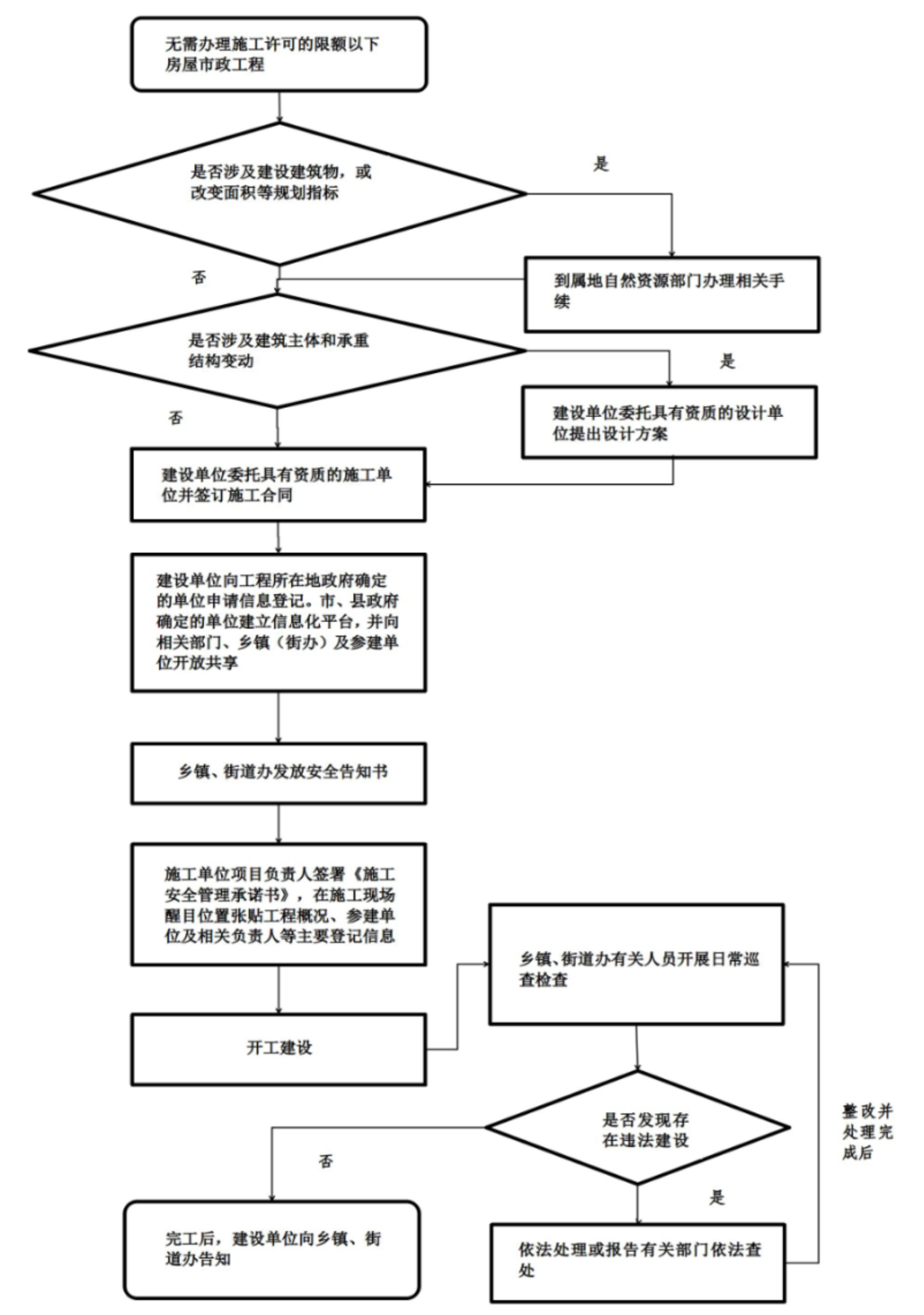 ¨限额以下的房屋建筑新建、改建、扩建和拆除工程(包括房屋建筑及其附属设施的建造和与其配套的线路、管道、设备的安装); ¨工程投资额在100万元以下(含100万元)的市政道路、管网、园林绿化等市政工程; ¨限额以下的公共建筑、商铺、办公楼、厂房等非住宅类人员密集和经营性场所房屋装饰装修; ¨限额以下的房屋拆除工程 ¨限额以下的既有建筑外立面装饰装修、改造维护等工程; ¨既有住宅加装电梯(土建施工部分)工程; ¨冷库工程; ¨其他限额以下房屋建筑和市政基础设施工程。 | ||