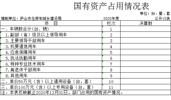 截至2019年12月31日,本部门国有资产占用情况见公开10表《国有资产占用情况表》。本部门共有车辆0辆,其中,副部(省)级及以上领导用车0辆、主要领导干部用车0辆、机要通信用车0辆、应急保障用车0辆、执法执勤用车0辆、特种专业技术用车0辆、其他用车0辆,其他用车主要是(略);单位价值50万元以上通用设备0台(套);单位价值100万元以上专用设备0台(套)。