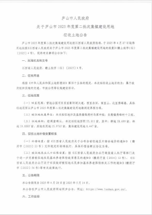 关于庐山市2025年度第二批次集镇建设用地征收土地公告