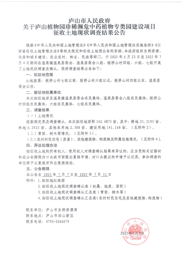庐山植物园珍稀濒危中药植物专类园建设项目征收土地现状调查结果公告