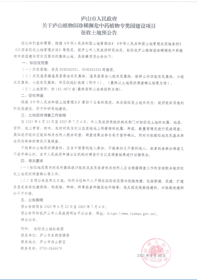 庐山植物园珍稀濒危中药植物专类园建设项目征收土地预公告