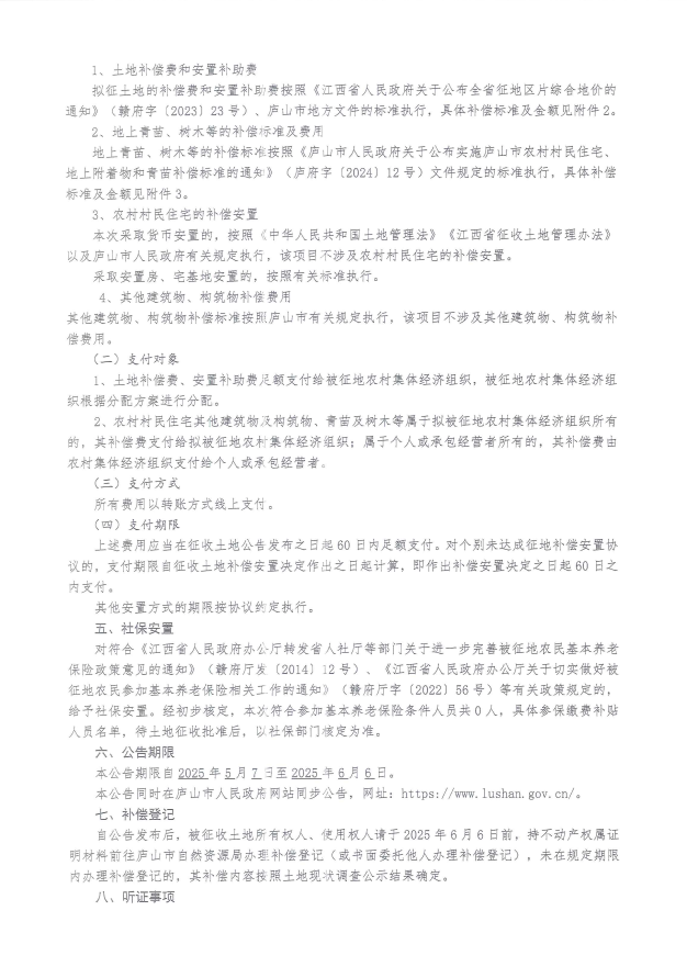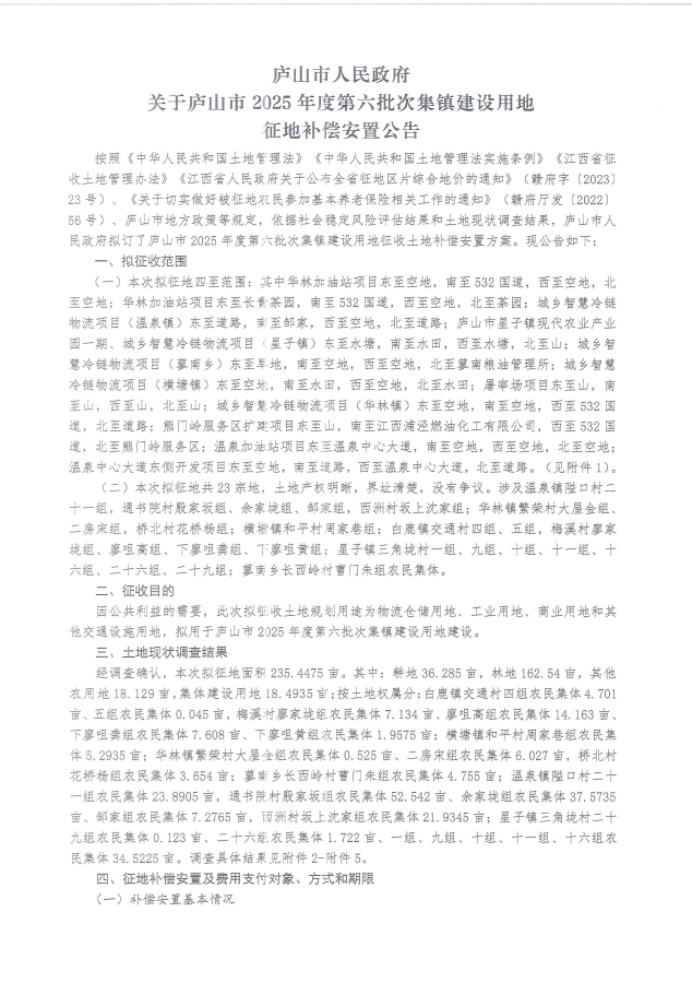 庐山市2025年度第六批次集镇建设用地征地补偿安置公告