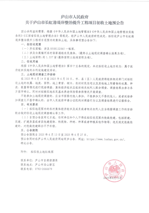 关于庐山市长虹港堤岸整治提升工程项目征收土地预公告