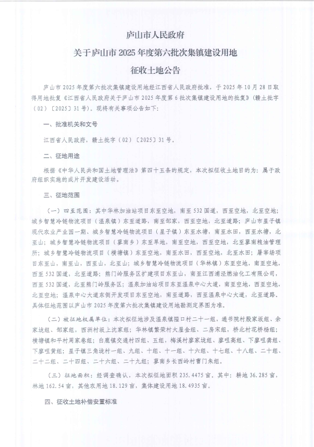 关于庐山市2025年度第六批次集镇建设用地征收土地公告