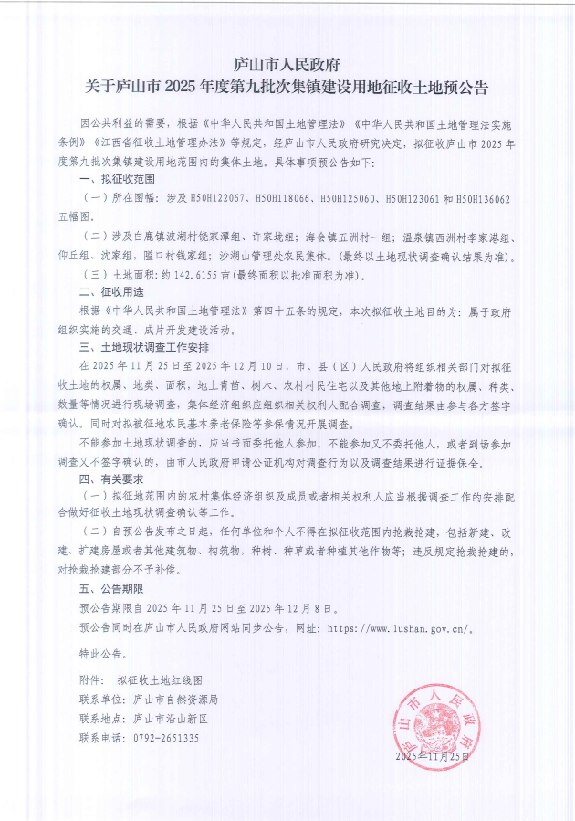 关于庐山市2025年度第九批次集镇建设用地征收土地预公告