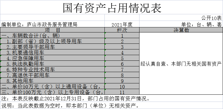 截止2021年12月31日,本部门(单位)国有资产占用情况见公开10表《国有资产占用情况表》。截止2020年12月31日,本部门共有车辆 0辆,其中,副部(省)级及以上领导用车 0辆、主要领导干部用车0辆、机要通信用车0辆、应急保障用车 0辆、执法执勤用车 0辆、特种专业技术用车0辆、其他用车 0辆。