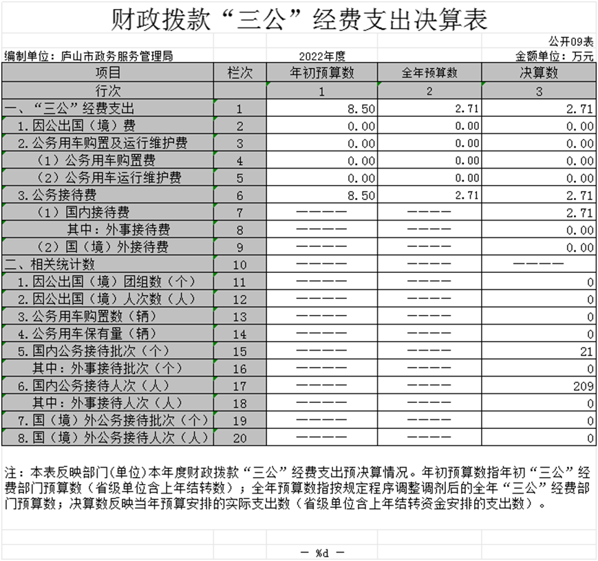 (二)公务接待费支出年初预算数为8.5万元,决算数为2.71万元,完成预算的31.9%,决算数较2021年增加1.01 万元,增长59.4 %,主要原因是:招商项目商务接待。决算数较年初预算数减少的主要原因是:受疫情影响,接待活动减少。全年国内公务接待21批,累计接待92人次,其中外事接待0批,累计接待0人次,主要为:一般公务接待,及招商引资商务接待。