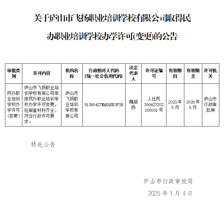 关于庐山市飞扬职业培训学校有限公司取得民办职业培训学校办学许可(变更)的公告
