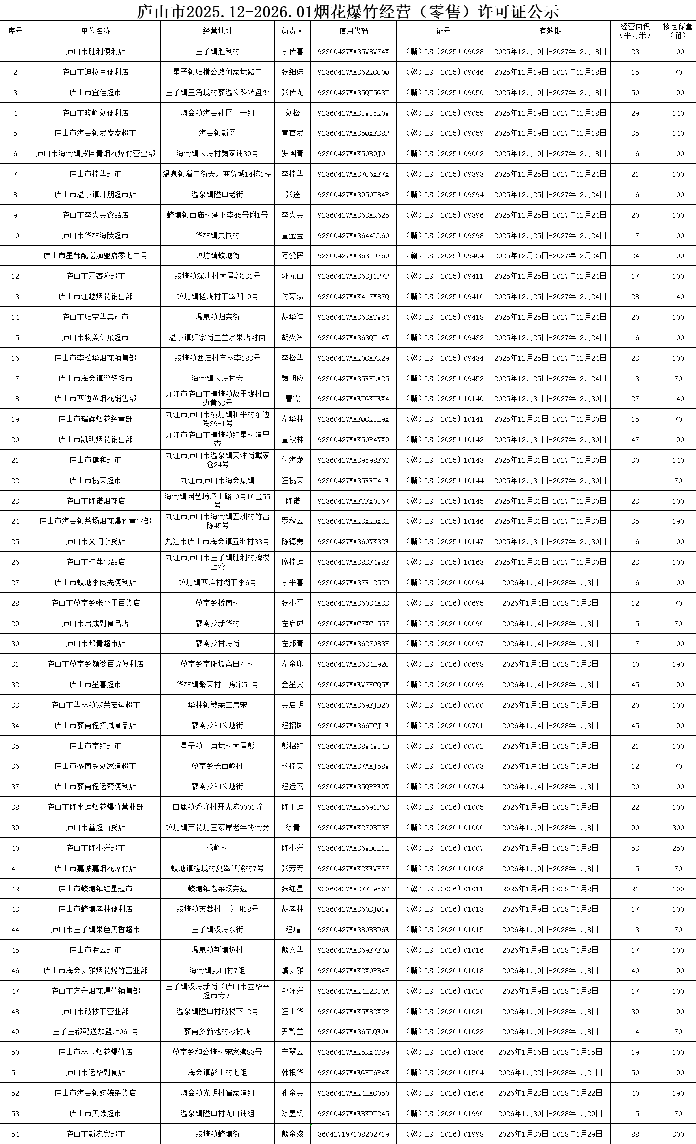 庐山市2025年12月-2026年1月烟花爆竹经营(零售)许可证公示