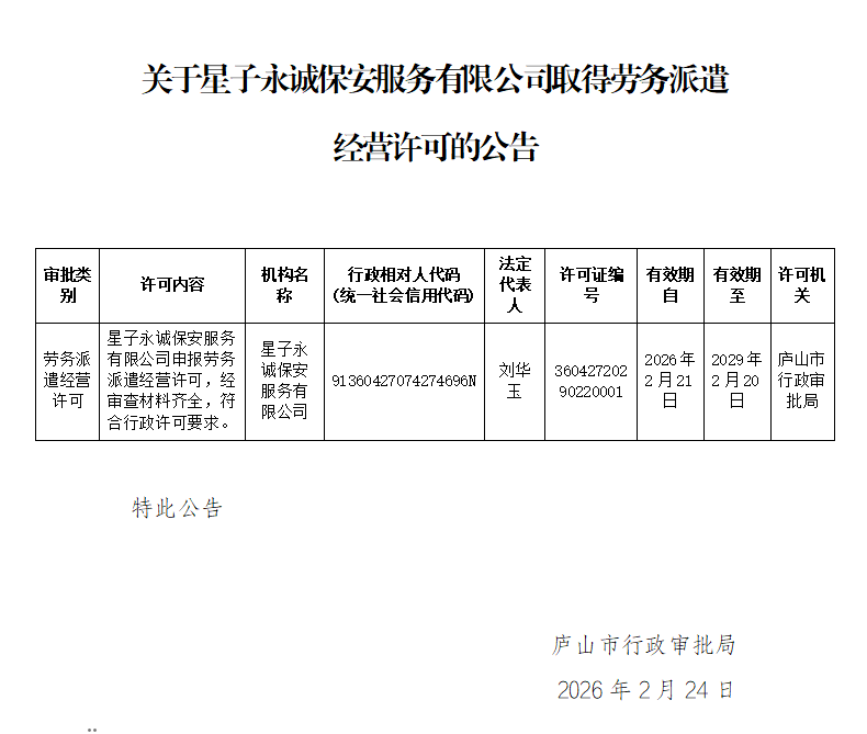关于星子永诚保安服务有限公司取得劳务派遣经营许可的公告