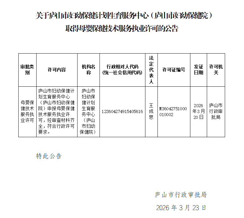关于庐山市妇幼保健计划生育服务中心(庐山市妇幼保健院)取得母婴保健技术服务执业许可的公告