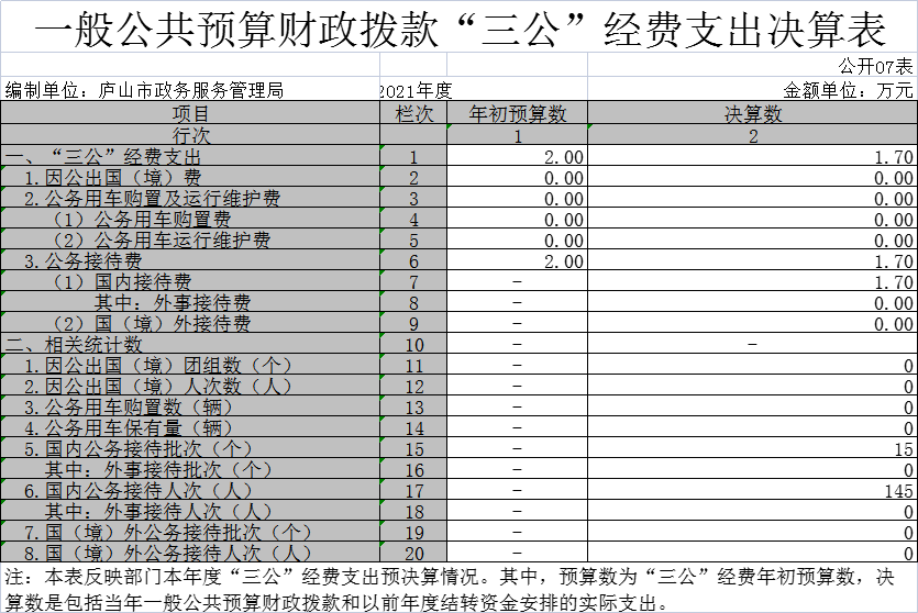 七、“三公”经费:指用一般公共预算财政拨款安排的因公出国(境)费、公务用车购置及运行维护费、公务接待费。其中,因公出国(境)费反映单位公务出国(境)的国际旅费、国外城市间交通费、住宿费、伙食费、培训费、公杂费等支出;公务用车购置费反映单位公务用车购置支出(含车辆购置税);公务用车运行维护费反映单位按规定保留的公务用车燃料费、维修费、过路过桥费、保险费、安全奖励费用等支出;公务接待费反映单位按规定开支的各类公务接待(含外宾接待)支出。