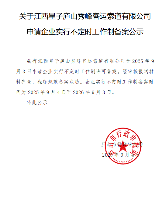 关于江西星子庐山秀峰客运索道有限公司申请企业实行不定时工作备案制公示