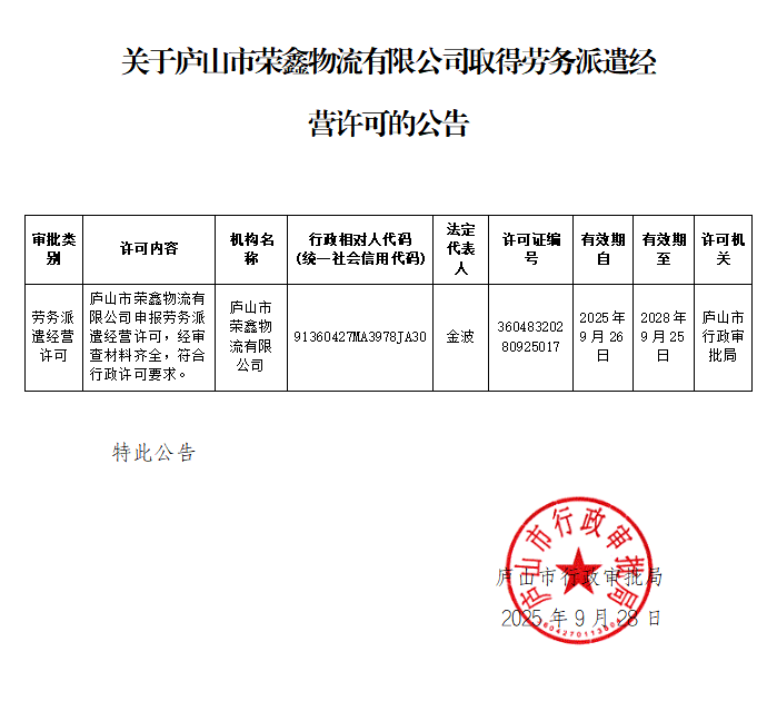 关于庐山市荣鑫物流有限公司取得劳务派遣许可的公告