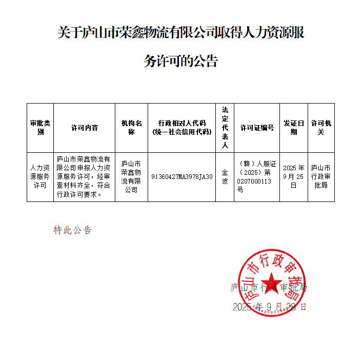 关于庐山市荣鑫物流有限公司取得人力资源服务许可的公告