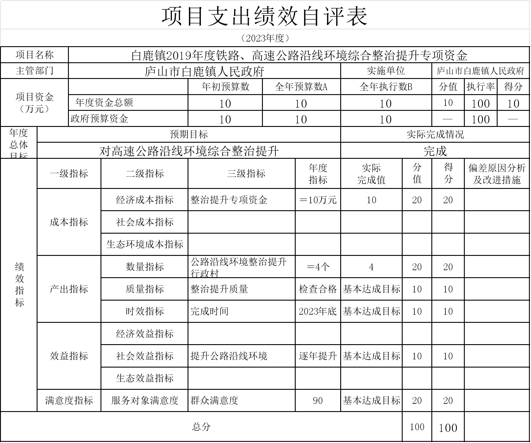 46-本部门白鹿镇农村人居环境大清理大整治大提升“百日攻坚”行动第一批专项工作经费项目支出绩效自评结果如下: