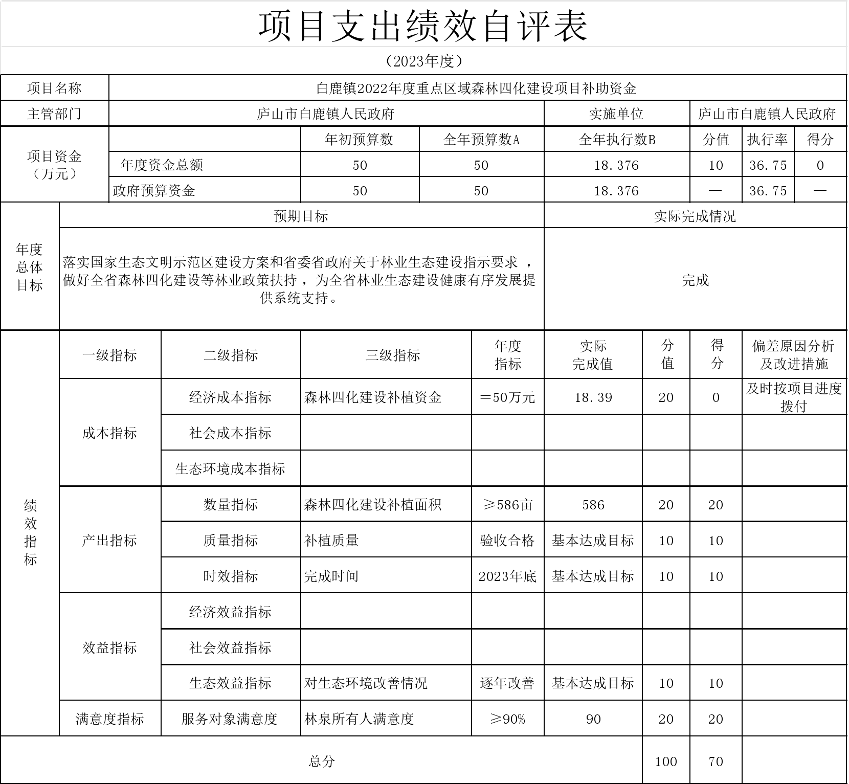36-本部门“白鹿镇2023年预算调整项目”项目支出绩效自评结果如下: