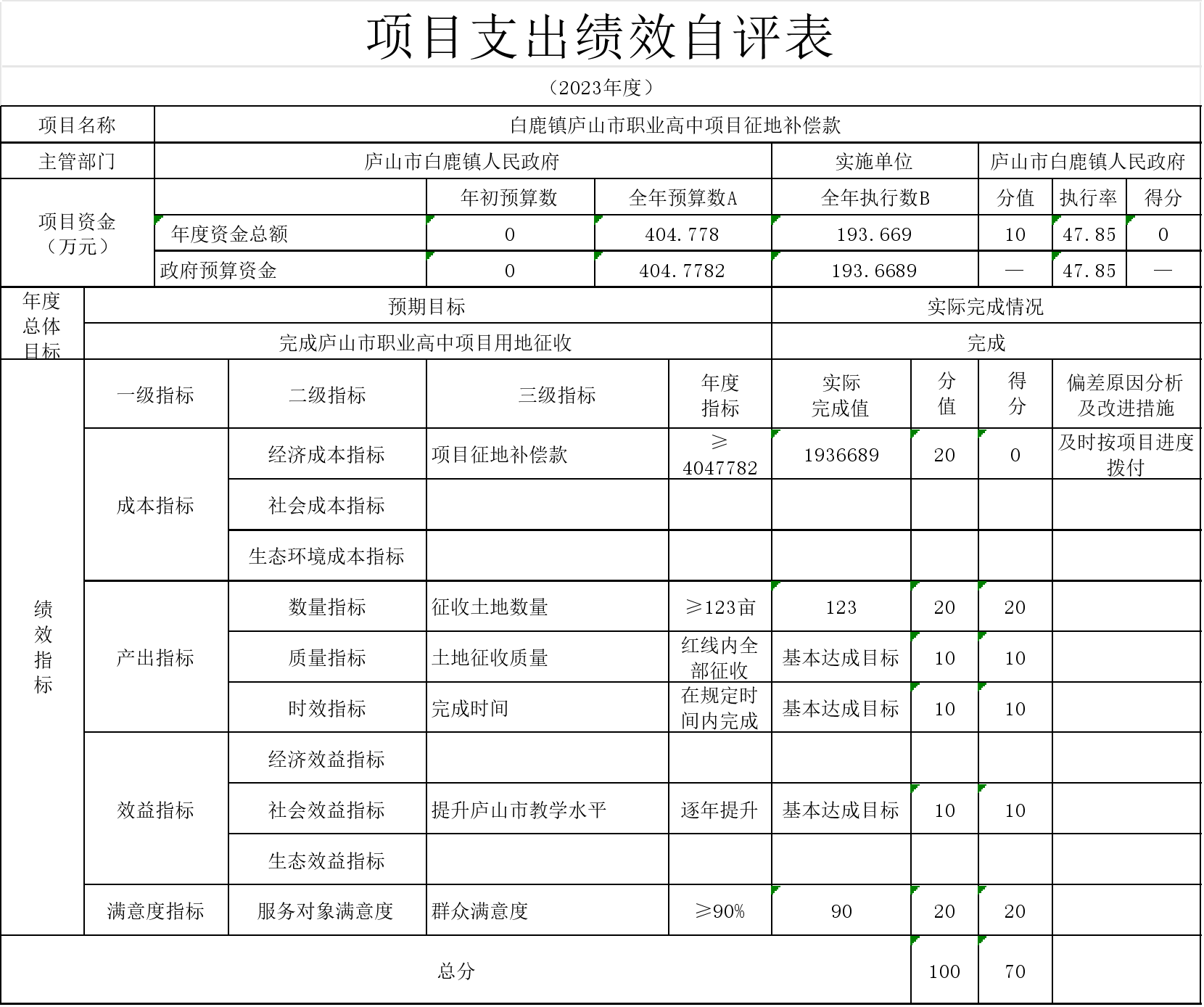45-本部门“白鹿镇庐山市职业高中项目征地补偿款”项目支出绩效自评结果如下: