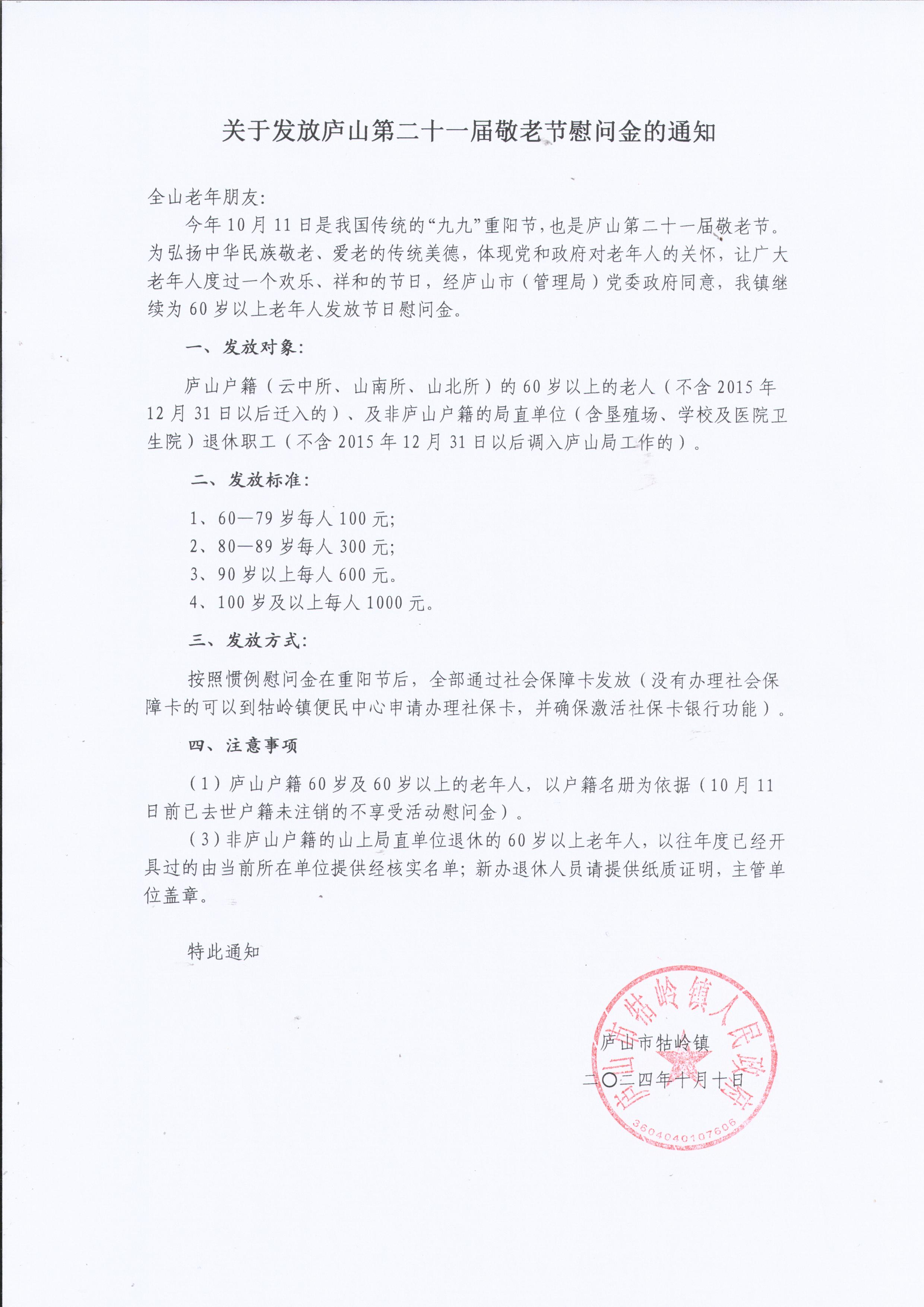 关于发放庐山第二十一届敬老节慰问金的通知