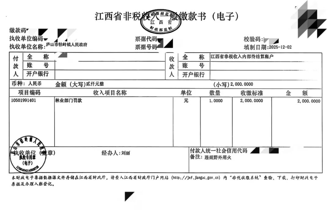 2025年11月28日9时,天然林保护中心牯岭保护站发现芦林社区芦林饭店餐厅后面冒烟情况,立刻赶到现场,立即制止并组织扑灭,同时联系芦林社区党组织书记袁慧赶到现场,确定是芦林社区居民丁某某,丁某某对野外焚烧树叶一事供认不讳。根据《中华人民共和国大气污染防治法》和《江西省森林防火条例》相关定,作出“责令改正,并处2000元罚款”的行政处罚决定。