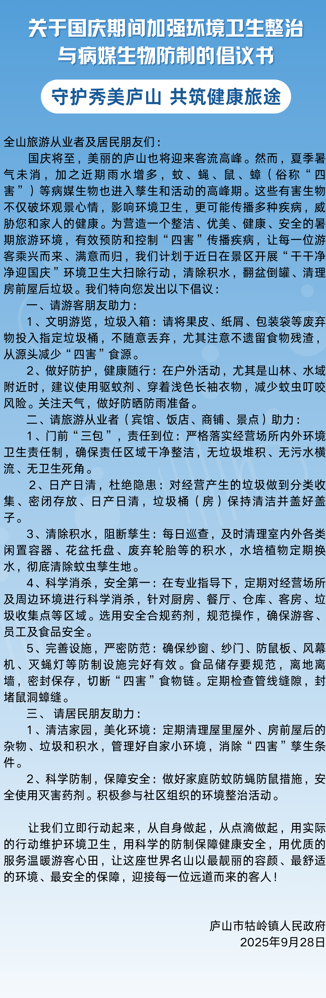关于国庆期间加强环境卫生整治与病媒生物防制的倡议书